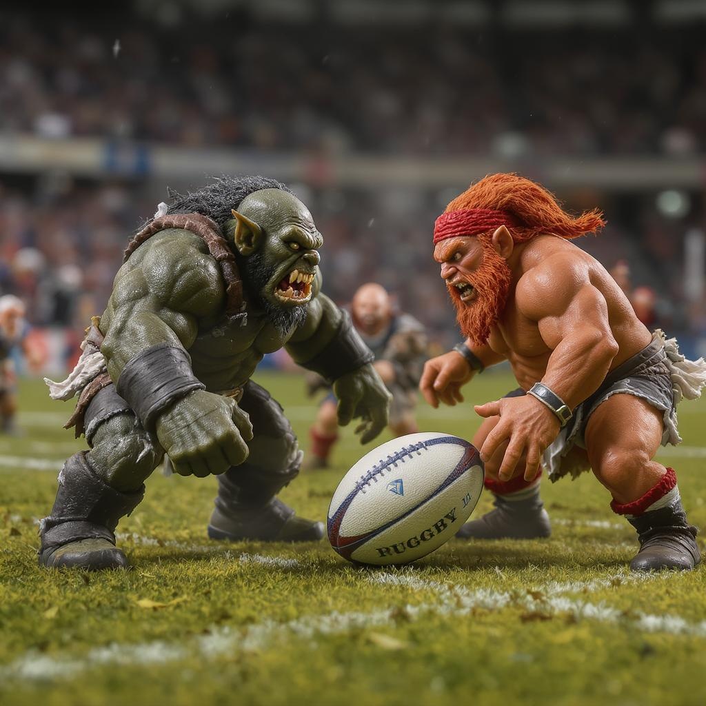Dynamic, realistic photograph on a fantasy football playfield depicting orcs and dwarfs in action. The scene is captured with a 1000mm f/1.2 lens, highlighting the highly detailed skin texture in a full-body shot. The orcs and dwarfs are engaged in an intense match, with vivid and expressive faces. The rugby ball appears unique, slightly polished and intricate. Despite being miniature figurines, they exude vibrancy and energy, far from uninspired or badly drawn. Every detail is proportionate and thoughtfully designed, with rich, contrasting colors. The scene evokes the atmosphere of an epic tabletop fantasy game, teeming with life, and adding an element of realism. The dwarfs wear leather caps instead of jelly bag caps, contributing to the thrilling and immersive setting.