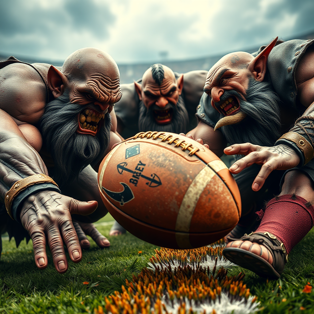 Dynamic realistic photograph, set on a vibrant fantasy football field with intense action, featuring fierce orks and determined dwarfs in a high-stakes moment. Captured with a 1000mm lens at f/1.2 for exceptional detail, their skin texture is vividly realistic, showcasing every scar and wrinkle. A full body shot emphasizes the dramatic poses as they battle for a weathered rugby ball. The scene avoids the pitfalls of plasticity and uninspired design, breathing life into each character with well-proportioned forms and carefully crafted details. The image bursts with rich colors and sharp contrast, creating an immersive and energetic tableau.