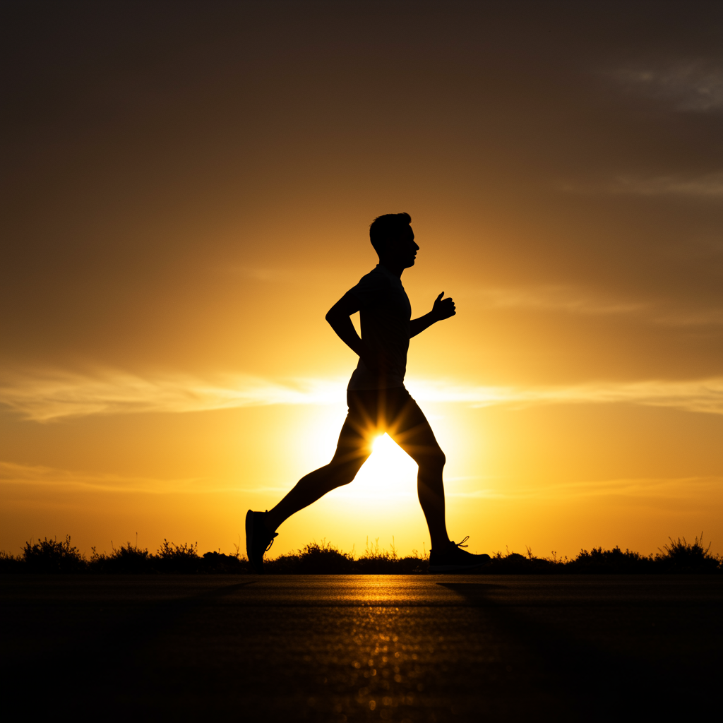 Dynamic runner silhouetted against a radiant sunrise, dramatic high-contrast lighting, vibrant fiery oranges and bright yellows illuminating highlights, richly textured shadows, cinematic motion blur, elite athletic branding essence, perfectly centered composition.