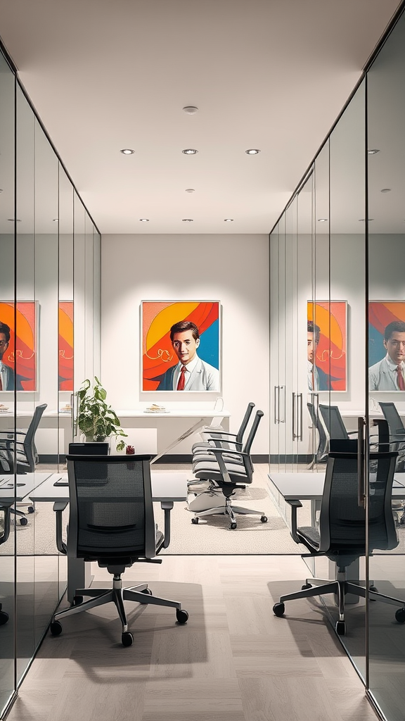 Dynamic snapshot of a contemporary office environment featuring minimalist design and ergonomic furniture, surrounded by sleek glass walls. The space is defined by clean lines and a neutral color palette, accentuated by bold and colorful art pieces that bring energy to the room. Soft studio lighting casts an inviting glow, enhancing the modern aesthetic. The composition captures the essence of a productive yet stylish workplace, inviting collaboration and creativity.