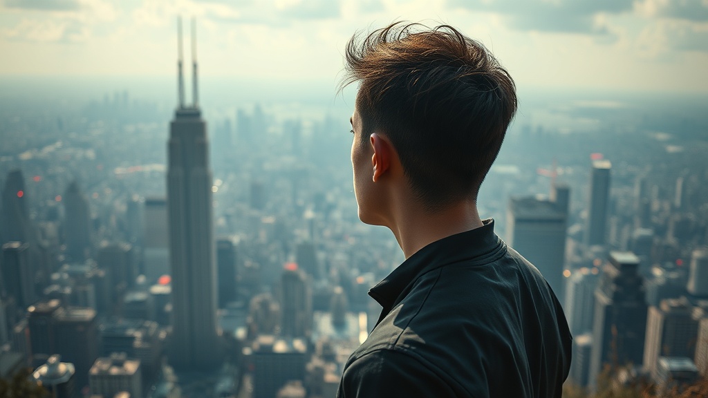 View this AI-generated image featuring a high detail dystopian cityscape in raw color featuring a full shot of a person standing on an overlook gazing at a sprawling cyberpunk city skyline the figure has a perfect face enhanced by raytracing and specular lighting shot with a shallow depth of field u