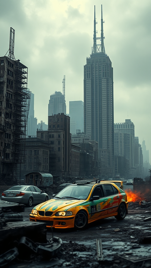 Dystopian cityscape with a gritty engine pulsing life into a bleak, post-apocalyptic world, where a somber, dramatic atmosphere envelops the scene. The city is highly detailed yet features a simple and deformed architecture, with buildings appearing ugly and noisy against a blurry, low contrast skyline. Amidst the decay, a car stands out as vibrant and colorful, introducing an unexpected burst of cheerful optimism into the otherwise grim surroundings. The stark contrast between the city's muted tones and the car's lively appearance creates a unique blend of despair and hope.