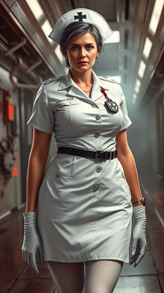 Dystopian future, Sci-Fi. Supervillain, nurse, bodyguard, Neo-Nazi? No one knows her actual age, she seems to recall World War II like she was actually there, though that was the early part if the 20th century. She is a nurse from back in those times, though she's a member of the Neo-Nazi party of the future. There are robots and super-soldiers where she is now. She is a tall, full figured but muscular woman, practically a giant at 6 ft 7. Caucasian woman of German descent. She is a matronly middle aged woman in her late 50's- early 60's (or so she appears to be). Her eyes are pale grey and very alert. Her hair is black with a few gray streaks in them, she keeps it pulled back and in a bun so she can wear her nurse hat. She wears no make-up, which makes her look very plain and frumpy, though she may have been beautiful once. She wears a white nurses uniform with a white lab coat on top. White stockings with white nurses shoes. There are indications she might have been a soldier once; she has all the discipline and demeanor of someone that was in the military. She is also a great warrior, able to fight in any style and use any weapon. Her weapon of choice is a hypodermic needle filled with her choice of poison, acid or tranquilizer. She has been called the "nurse of death" , at least to those that weren't on her side. She is a very subtle Nazi, though she does occasionally wear a tiny gold swastika pin on her uniform. She is stoic and stiff, no time for nonsense or frivolity. Full body pose, probably holding her hypodermic needle...