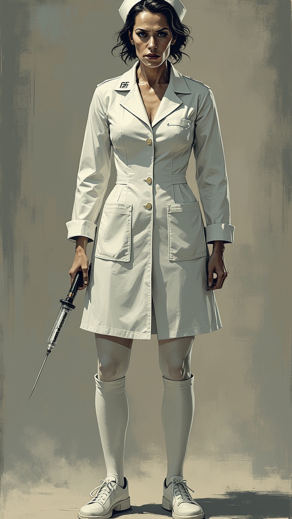 Dystopian future, Sci-Fi. Supervillain, nurse, bodyguard, Neo-Nazi? No one knows her actual age, she seems to recall World War II like she was actually there, though that was the early part of the 20th century. She is a nurse from back in those times, though she's a member of the Neo-Nazi party of the future. There are robots and super-soldiers where she is now. She is a tall, full figured but muscular woman, practically a giant at 6 ft 7. Caucasian woman of German descent. She is a matronly middle aged woman in her late 50's- early 60's (or so she appears to be). Her eyes are pale grey and very alert. Her hair is black with a few gray streaks in them, she keeps it pulled back and in a bun so she can wear her nurse hat. She wears no make-up, which makes her look very plain and frumpy, though she may have been beautiful once. She wears a white nurses uniform with a white lab coat on top. White stockings with white nurses shoes. There are indications she might have been a soldier once; she has all the discipline and demeanor of someone that was in the military. She is also a great warrior, able to fight in any style and use any weapon. Her weapon of choice is a hypodermic needle filled with her choice of poison, acid or tranquilizer. She has been called the "nurse of death" , at least to those that weren't on her side. She is a very subtle Nazi, though she does occasionally wear a tiny gold swastika pin on her uniform. She is stoic and stiff, no time for nonsense or frivolity. Full body pose, probably holding her hypodermic needle...