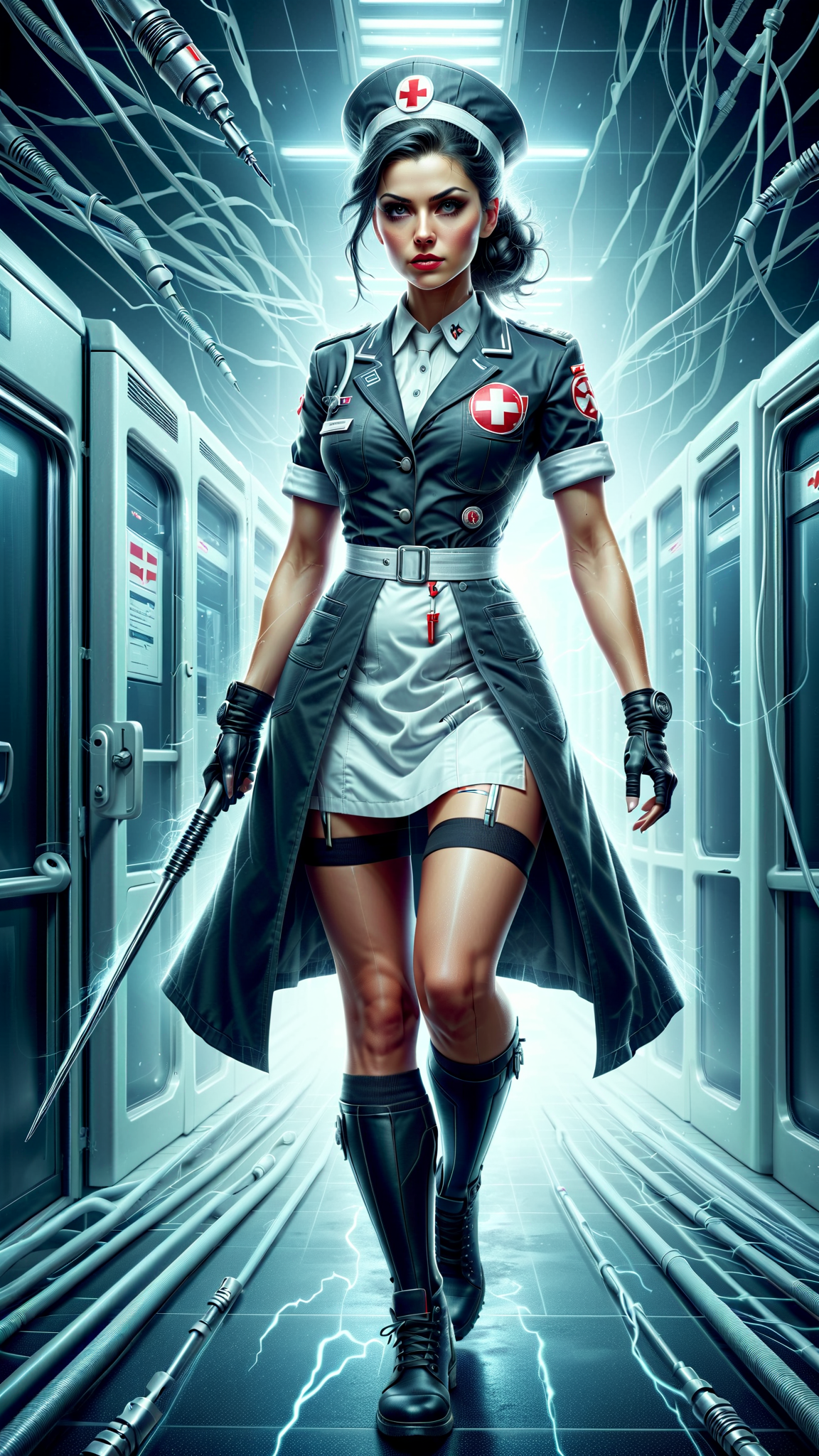 Dystopian future, Sci-Fi. Supervillain, nurse, bodyguard, Neo-Nazi? No one knows her actual age, she seems to recall World War II like she was actually there, though that was the early part of the 20th century. She is a nurse from back in those times, though she's a member of the Neo-Nazi party of the future. There are robots and super-soldiers where she is now. She is a tall, full figured but muscular and fit woman, practically a giant at 6 ft 7. Caucasian woman of German descent. She is a matronly middle aged woman in her mid to late 60's (or so she appears to be). Her eyes are pale grey and very alert. Her hair is black with a few gray streaks in them; she keeps it pulled back and in a bun so she can wear her nurse hat. She wears no make-up, which makes her look very plain and frumpy, though she may have been beautiful once. She wears a white nurses uniform with a white lab coat on top. White stockings with white nurses shoes. There are indications she might have been a soldier once; she has all the discipline and demeanor of someone that was in the military. She is also a great warrior, able to fight in any style and use any weapon. Her weapon of choice is a hypodermic needle filled with her choice of poison, acid or tranquilizer. She has been called the "nurse of death" , at least to those that weren't on her side. She is a very subtle Nazi, though she does occasionally wear a tiny gold swastika pin on her uniform. She is stoic and stiff, no time for nonsense or frivolity. Full body pose, probably holding her hypodermic needle...