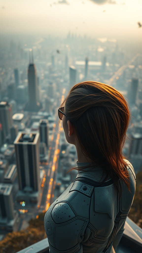 Dystopian high detail RAW color photo full shot standing on an overlook gazing out at a sprawling cyberpunk city skyline with a flawless face featuring raytracing specular lighting shallow depth of field captured with a 200mm lens in hard focus offering a smooth cinematic film still CGI look created with 3D octane render subtle lowres elements adding to the atmosphere with textural nuances embracing JPEG artifacts that enhance the gritty urban aesthetic the scene is devoid of any physical anomalies or distortions maintaining realistic anatomy and proportions in this immersive futuristic vision.