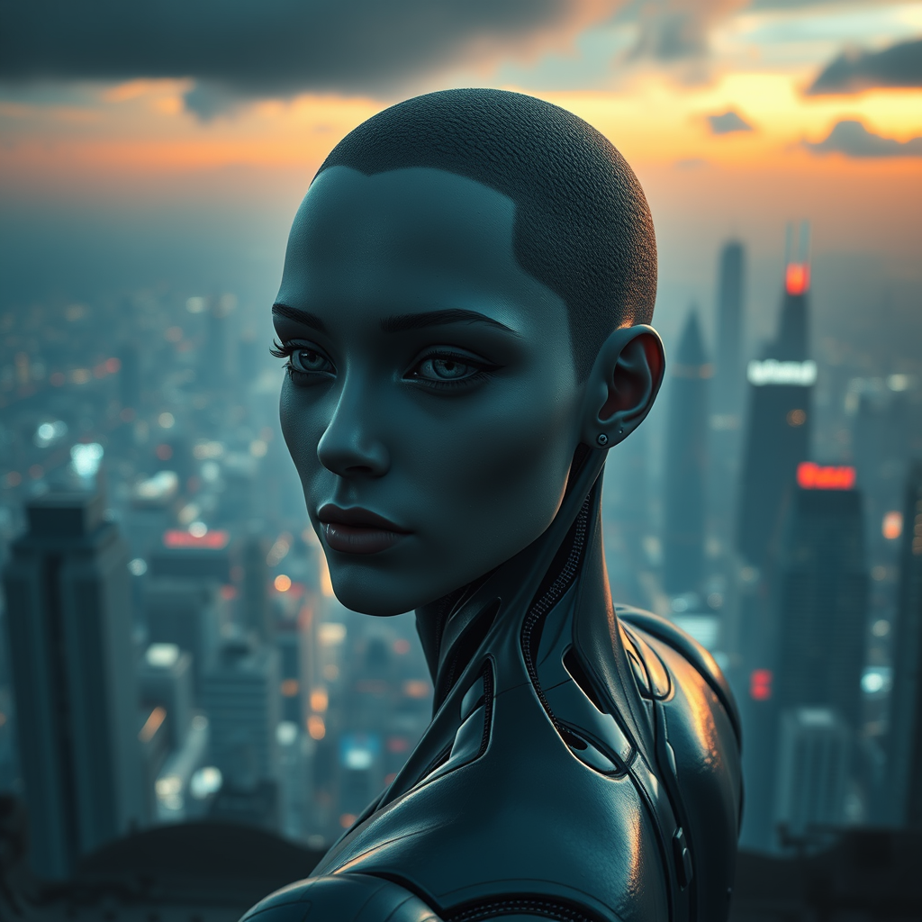 Dystopian high detail RAW color photo full shot standing on an overlook gazing out at a sprawling cyberpunk city skyline with a flawless face featuring raytracing and specular lighting shallow depth of field using a 200mm lens, ensuring hard focus, smooth cinematic film still CGI 3d rendering, with octane render elements. Avoid lowres, text, cropped or low quality appearances, and eliminate jpeg artifacts. Maintain anatomical precision with no duplicate or morbid features, ensuring facial and hand details are proportionate and well-drawn, avoiding any mutations or deformations, keeping limbs intact without extra components, missing or malformed features.