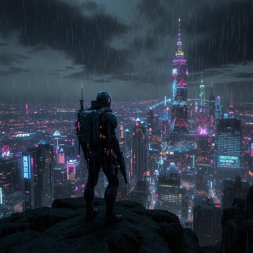 Dystopian high detail RAW color photo full shot standing on an overlook gazing at a sprawling cyberpunk city skyline, flawless face, raytracing, specular lighting, shallow depth of field, 200mm lens, sharp focus, smooth cinematic film still, CGI 3d rendering.