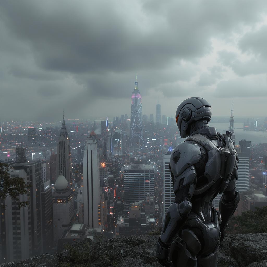 Dystopian high detail RAW color photo full shot standing on an overlook gazing at an expansive cyberpunk city skyline perfect facial features raytracing specular lighting shallow depth of field 200mm lens hard focus smooth cinematic film still CGI 3D lifelike octane render low-resolution with minor imperfections artistic blur unique character design maintaining realistic proportions clear-defined anatomy seamlessly integrated into the scene.