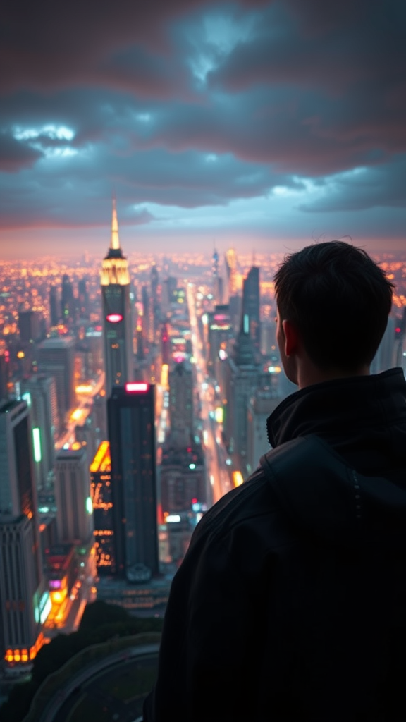 Dystopian, highly detailed color photograph depicting a person standing on an overlook gazing at a vast cyberpunk city skyline. The scene features a perfect face with enhanced raytracing and specular lighting, showcasing a shallow depth of field through a 200mm lens. The setting captures a sleek cinematic film still, blending CGI elements with octane render techniques. The subject is portrayed with cinematic clarity, avoiding imperfections like duplicated or mutated features, ensuring well-proportioned anatomy and natural proportions. The landscape is futuristic, vibrant with neons, focusing on the sprawling urban environment, conveying an immersive, high-tech atmosphere.
