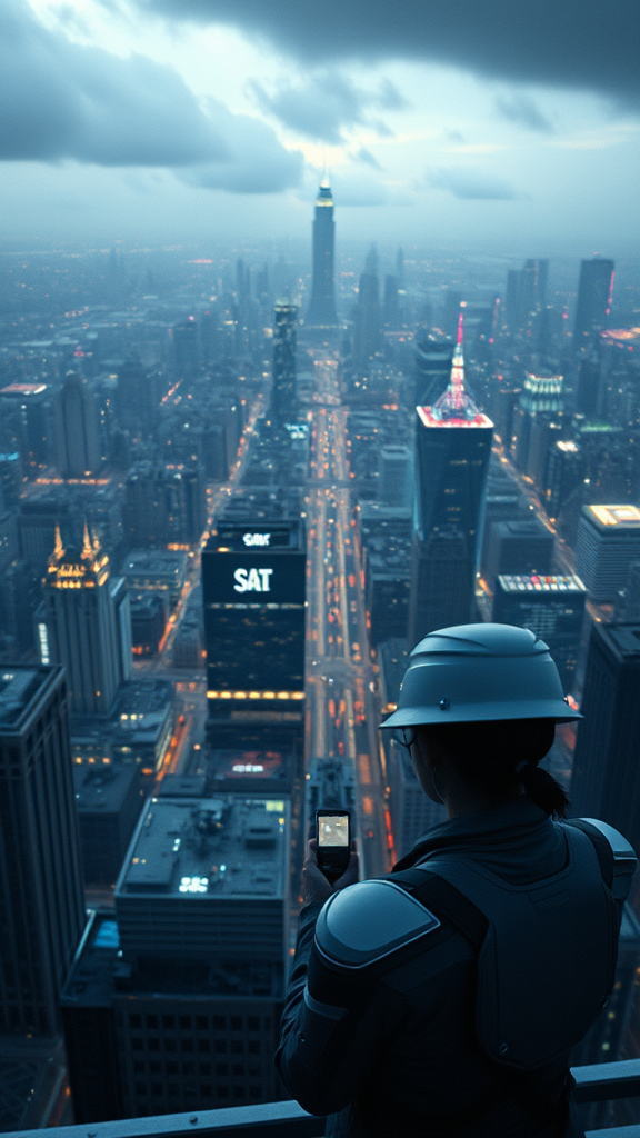 Dystopian, highly detailed RAW color photo of a full shot, standing on an overlook gazing at the sprawling cyberpunk city skyline, perfect facial features, with raytracing and specular lighting enhancing the scene, shallow depth of field created by a 200mm lens, with hard focus providing a smooth cinematic film still CGI vibe, rendered in 3D through octane. The image retains its texture with subtle low-resolution elements and jpeg artifacts, without compromising on the intriguing combination of futuristic aesthetics and realism. Despite minor imperfections like nominal cropping or slight pixelation, the overall composition is captivating, with careful attention to avoiding distortions like extra limbs or disfigured appearances. The futuristic allure of the cityscape prevails through a balance of intense detail and artistic interpretation, while maintaining anatomical accuracy and coherence.