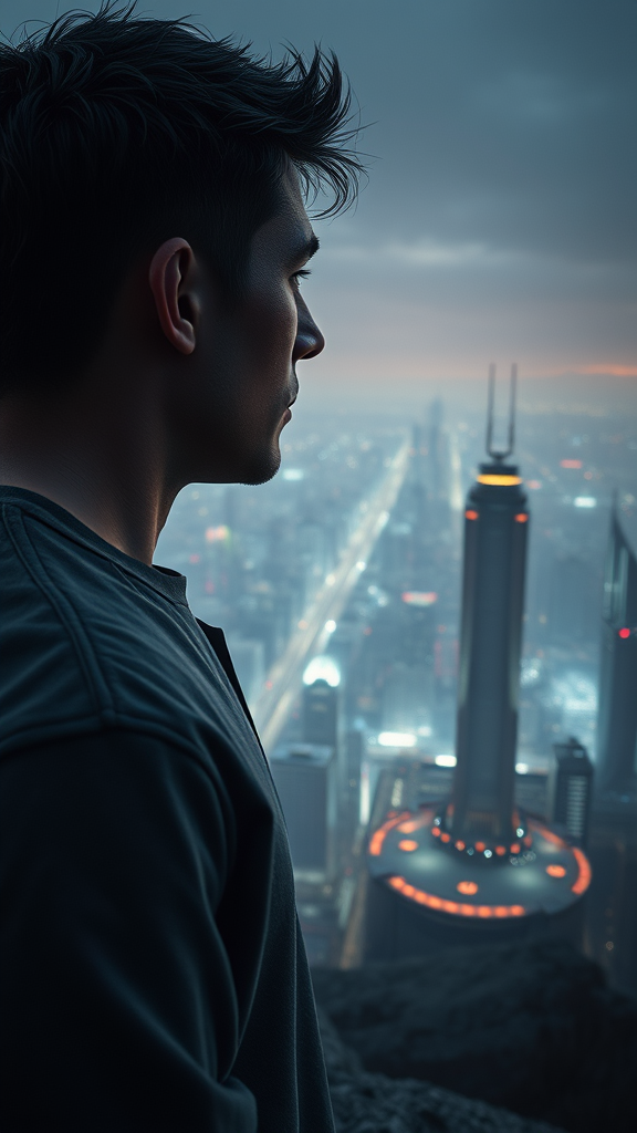 Dystopian landscape, highly detailed image capturing a full shot of an individual standing on a promontory gazing at the expansive cyberpunk cityscape, flawless facial features, enhanced by dramatic raytracing and specular lighting, using a shallow depth of field with a 200mm lens for striking focus. The visual is smooth and reminiscent of a cinematic film still, blending CGI, 3D modeling, and octane rendering. The setting conveys a futuristic yet gritty atmosphere, free from imperfections like distortion, awkward anatomy, or duplicates, maintaining perfect proportions and a lifelike appearance. The scene excludes unwanted artifacts, presenting a polished, evocative image.
