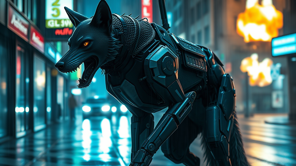 Dystopian militarized wolf cyborg hybrid with scaly, metallic armor, stealthy reconnaissance mission, neon-lit urban jungle, dark alleys, rain-soaked streets, intensity beams, motion trails, blurred explosions, distant nuclear fire, high-tech crystalline enhancements, eyes read data streams, slender torso, reinforced claws, night vision, sonar ears, retextured digital fur, distortions, unnatural shape convergence, liberated mobile device screens, sparking amputated limbs, screened exemptions, unarmor rendering, arched pelvis, iconof striking posture, hazardous halation, heat distortion, io, predictable precognitive brushes.