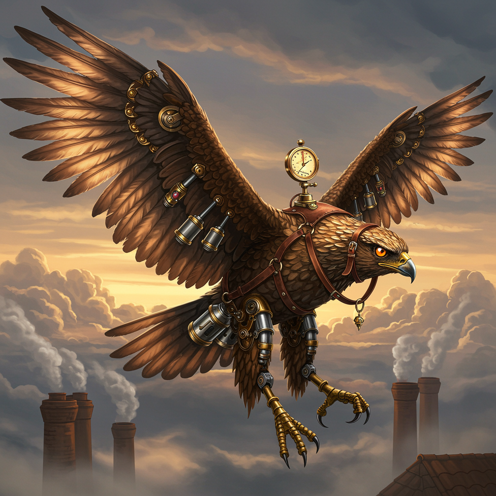 A magnificent eagle with brass and copper feathers, its wings adorned with intricate gears and steam-powered mechanisms, soaring through a sky of swirling clouds and chimneys. The bird's eyes are glowing with a subtle amber light, and its talons are fashioned from polished steel. Tiny puffing pistons and winding cogs enable it to glide effortlessly, leaving behind a trail of misty steam. A leather harness with delicate golden filigree secures a small navigation device on its back, symbolizing both elegance and precision in a world of Victorian industrial innovation.