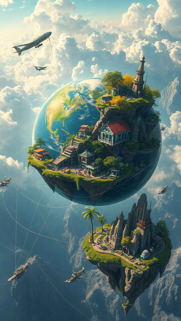 Earth reimagined with a vibrant tapestry of floating islands each hosting unique ecosystems, where gravity is localized and airships traverse sky routes, connecting diverse cultures that have evolved technologies powered by harnessed electromagnetic fields.