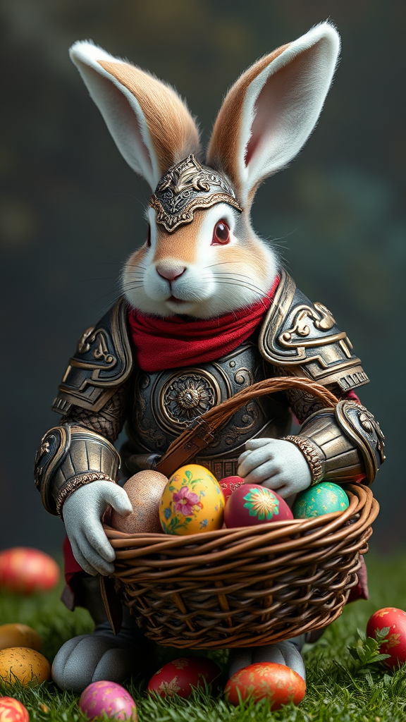 Easter bunny clad in elaborately decorated light armor, soft and fluffy fur contrasting with the intricate designs, holding a basket overflowing with vibrantly painted eggs, 70mm scale, cinematic and highly detailed, with an imaginative twist.
