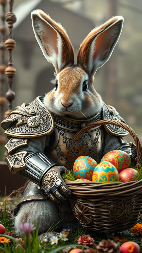 Easter bunny wearing intricately designed light armor adorned with ornate patterns, its fluffy fur peeking through the gaps, holding a basket brimming with colorful, elaborately painted eggs, scene captured in 70mm film quality, cinematic and richly detailed, artistically rendered with a playful touch.