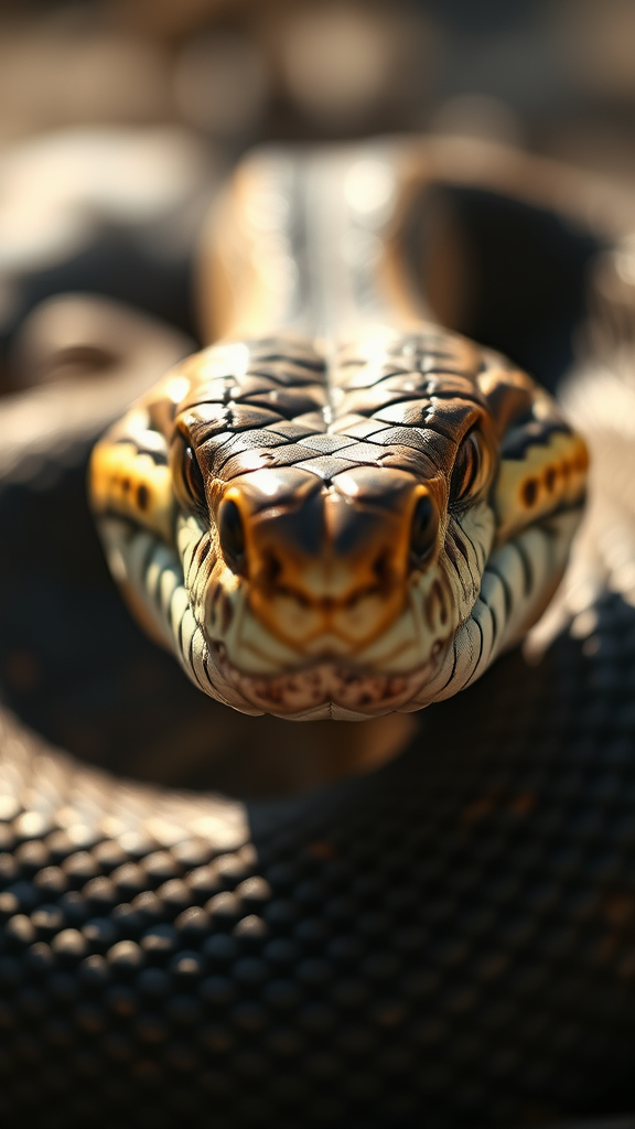 Eastern diamondback rattlesnake poised to strike, intense stare, DSLR capture, macro perspective, rich depth, 24 megapixels, intricate ray-traced shadows, sunlit setting, photorealistic and hyper detailed, ultra closeup shot using a 75mm lens, emphasis on texture and pattern, vivid realism, 3:2 aspect ratio.