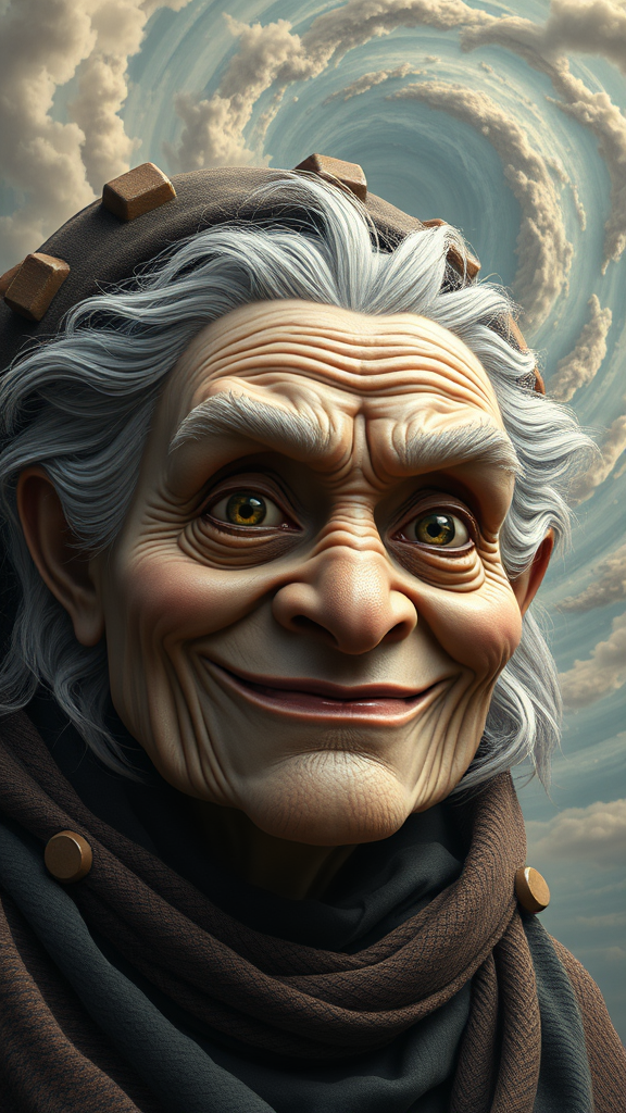 Eccentric ancient grandma with a mischievous grin, under a surreal and swirling sky reminiscent of Mundford's visions, baroque maximalist, chibi influenced by Artificial Nightmares, Stanley Artgerm, and Tim Burton. Her face features intricate detailing with piercing sharp eyes, ULTRA-photorealistic, dynamic, detailed, and organic design. Exquisite high-definition artistry, perfect photo-realistic concepts, and elaborate details akin to octane render style, trending on artstation, 8k art photography. A soft, volumetric cinematic light with chiaroscuro enhances the masterpiece, blending styles of oil on canvas reminiscent of Raphael, Caravaggio, infused with the imagination of Greg Rutkowski, Beeple, Beksinski, and Giger.