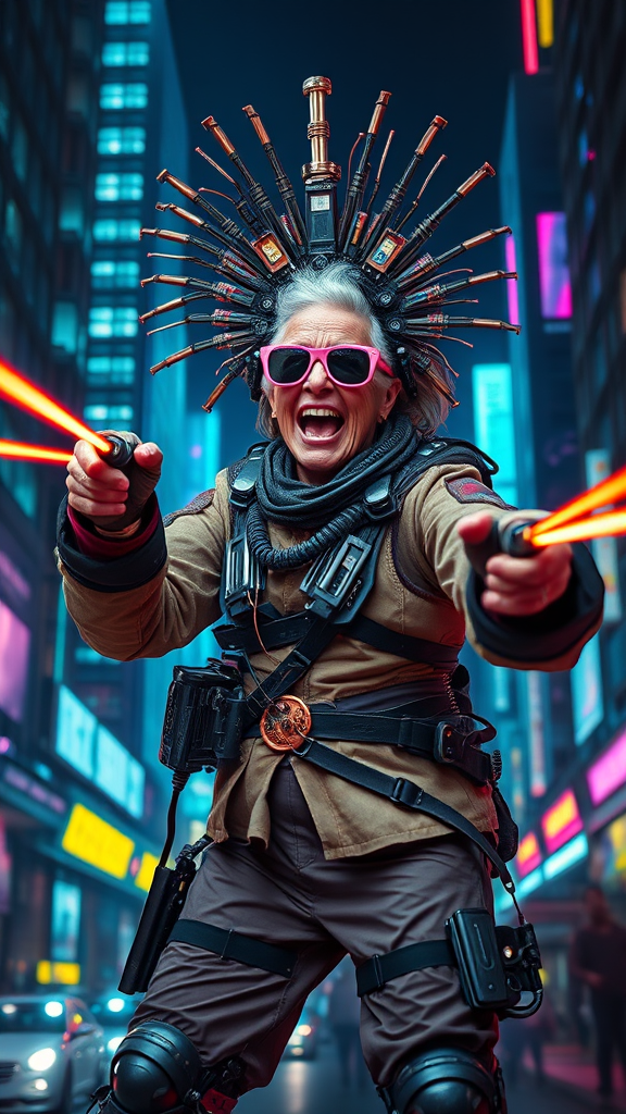 Eccentric grandma in a cybernetic combat suit, cackling wildly, shooting laser beams in every direction, striking a dynamic pose, ultra-wide angle, full-body view. Adorned in an elaborate biomechanical headdress and outrageous sunglasses, her outfit a blend of sleek technology and worn fabric. A backdrop of glowing blacklight cityscape at night envelops her. Hyper-realistic photography with incredible detail, 8k resolution. Amidst the futuristic chaos, neon lights dance, adding an electrifying ambiance.
