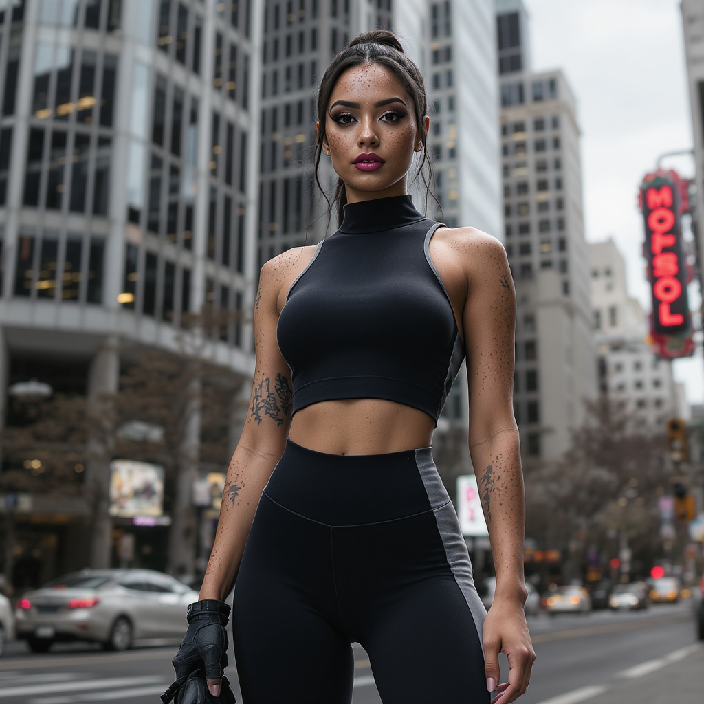 View this AI-generated image featuring a hyperrealistic editorial image features a striking multiracial woman with captivating freckles wearing a stylish and refined athleisure outfit set against an urban landscape the composition captures her symmetrical face and body portraying elegance and sophis