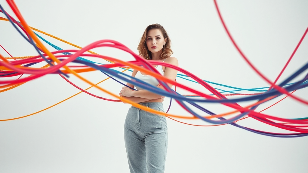Editorial photography captures the essence of a vibrant scene with a focus on colorful cables intertwining in an artistic pattern. A woman stands confidently against a pristine white background, her posture conveying a cinematic allure. The composition emphasizes vivid contrasts, highlighting the intricate details and dynamic interplay of colors and textures. This raw yet polished visual narrative embodies an avant-garde aesthetic, inviting viewers to appreciate the elegance found in everyday objects.