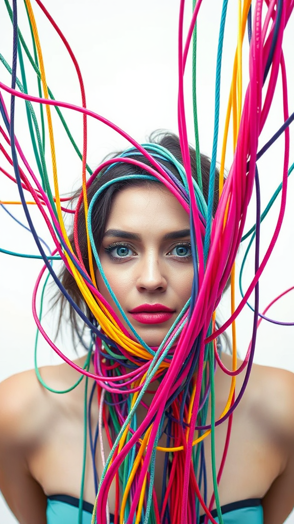 Editorial photography, front-facing shot of a woman intertwined with colorful cables against a white background, evoking a cinematic feel. The image captures vibrant energy and dynamic composition, highlighting the vivid hues and textures of the cables, while emphasizing the woman's expressive pose. A raw and personalized touch enhances the overall aesthetic, bringing out a unique and engaging visual narrative.