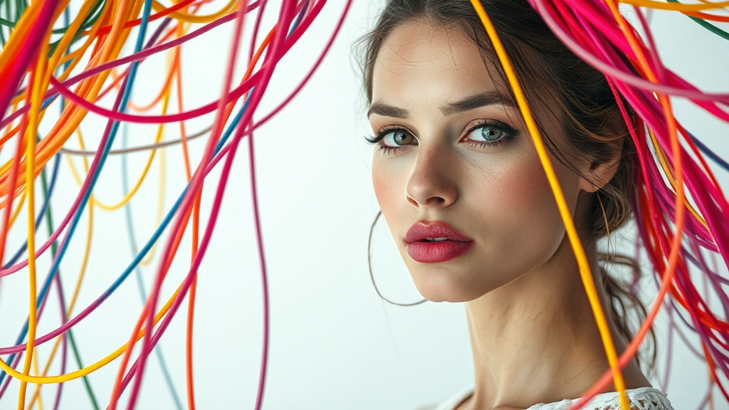 Editorial photography, frontal shot featuring an array of vibrant cables intertwined like an abstract tapestry, woman with an expressive gaze, set against a pristine white backdrop, cinematic atmosphere. The composition highlights the striking contrast between the cables' vivid hues and the woman's poised elegance, creating a captivating visual narrative. With an emphasis on raw, unfiltered emotion, the image embraces a dynamic synergy of color and form, evoking a sense of modern artistry and innovation.