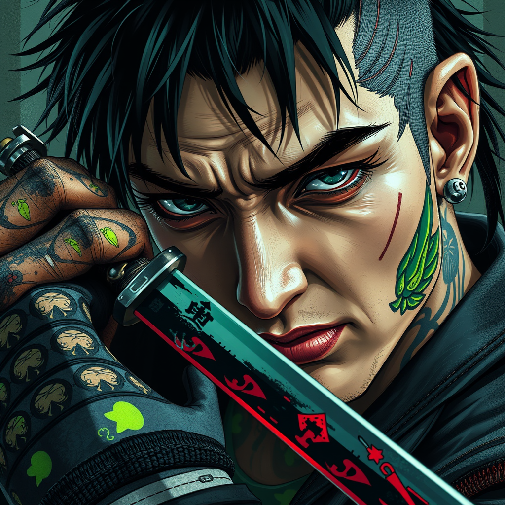 Editorial photography of a gothic punk Japanese rebel with neon green and black tattoos, brandishing a katana, close-up, in anime-inspired art style, featuring expressive textures, photo-realistic techniques, and a vibrant palette. Incorporating hurufiyya elements, 32k ultra-high definition, dynamic brushwork, realistic hyper-detailed portraits, with sharp angles and hard-edged painting, influenced by ukiyo-e. The composition exudes an astonishing beauty as it captures the essence of rebellion and artistry.