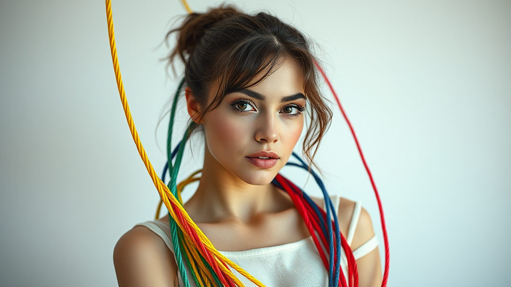 Editorial photography portrait of a woman posing with vibrant, multicolored cables draped artfully around her, set against a clean white background, with a cinematic feel. The image captures a raw and dynamic aesthetic, highlighting the interplay of textures and colors, evoking a modern and personalized style with a touch of elegance and creativity.