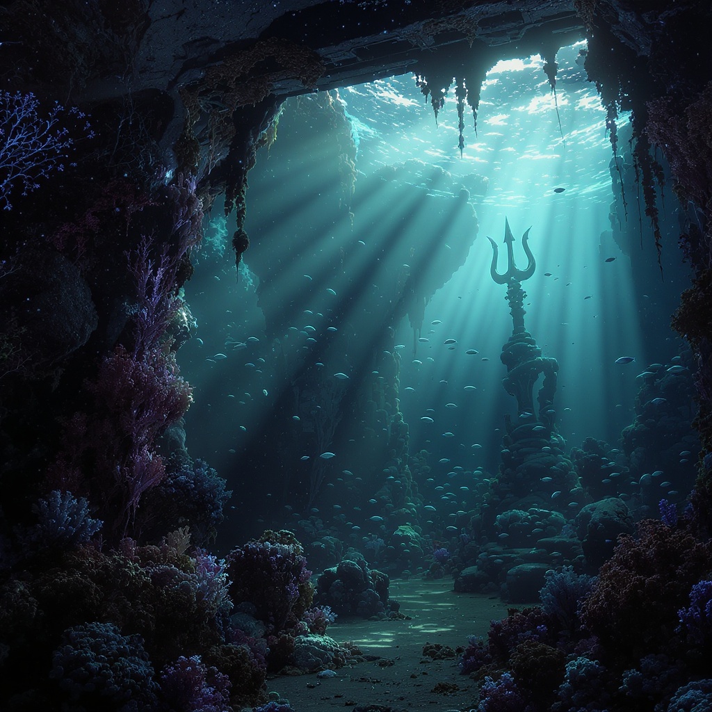 Edwin Deakin-inspired, mysterious underwater ruins nestled at the ocean's depths, ancient and abandoned, ethereal and mystical ambiance, haunted by the passage of time, coral overgrown and vibrant. Sunlight pierces from the surface, creating scattered light and a cinematic scene. Atmospheric with volumetric lighting and deep shadows cast by water, teeming with sea life. Fish swim gracefully near a majestic trident statue. The scene is enriched with bokeh effects and depth of field, using ray tracing for an immersive feel, designed in 16k UHD quality for an HDR experience; infused with surreal and dreamlike elements, evoking the sensation of an UnrealisticDream or occasional BadDream.