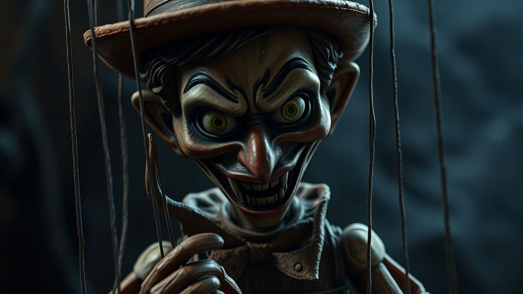 Eerie and sinister marionette Pinocchio, with a malevolent grin and shadowy eyes, lifelike wooden features twisted in a grotesque manner, portrayed against a dark, mysterious backdrop. Intricate fantasy detailing reminiscent of D&D lore, a chilling puppet with diabolical intent, strings coiled like serpents, set in an enchanting and ominous realm, capturing the essence of dark fantasy art, with a vivid, haunting presence.