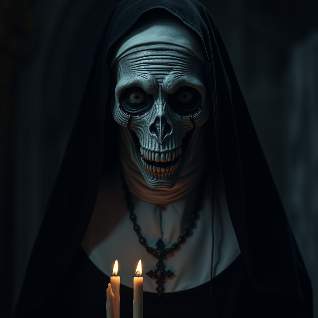 Eerie and unsettling nun with an unholy aura, exuding a chilling and creepy vibe, set in a dark and foreboding atmosphere, resembling a ghoul with intricate and detailed design, captured with dramatic photography lighting in a photorealistic and cinematic style, high-resolution 8k quality, aspect ratio 9:16.