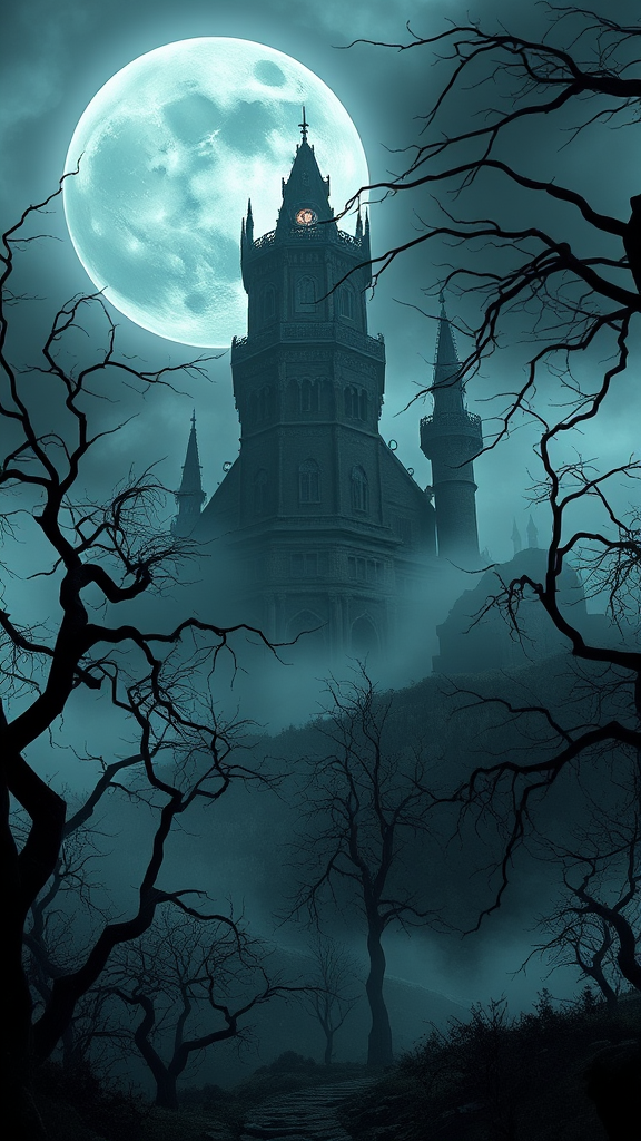 Eerie moonlit landscape featuring a gothic vampire castle, Nosferatu emerging from the shadows with elongated fingers and haunting eyes, surrounded by swirling mist, dark twisting trees, and a chilling ambiance, utilizing Daz3D for realistic and dramatic rendering, embodying a symphony of horror with a subtle blend of nightmares and surreal artistry.