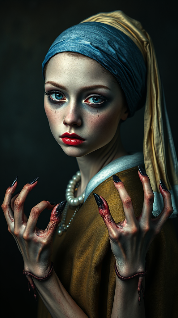 Eerie portrait of a girl inspired by "Girl with a Pearl Earring," set in a horror scene with an unsettling atmosphere, featuring intricate and highly detailed elements and remarkable anatomy. The image portrays a surreal, twisted version of elegance, highlighting a duplicated and mutated facial structure with crossed eyes and elongated neck. Her hands are aberrantly mutated, with extra fingers extending unnaturally. Rendered in best quality, 8k resolution, UHD, and HDR to capture every disturbing nuance. The scene avoids any low-resolution artifacts, watermarks, logos, or text intrusions, providing a seamless and haunting portrayal that remains sharply in focus.