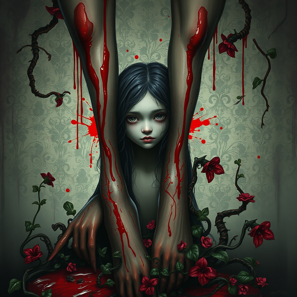 Eerie scene with elongated legs, dark creeping veins, oozing oil, and carnivorous plants entwined with ivy. A girl's somber face emerges amid the gloom, highlighted by vivid red splashes and subtle red undertones. The backdrop is adorned with an intricate floral pattern. The illustration is a fine art painting rendered in 8K with dramatic rim and artificial lighting.