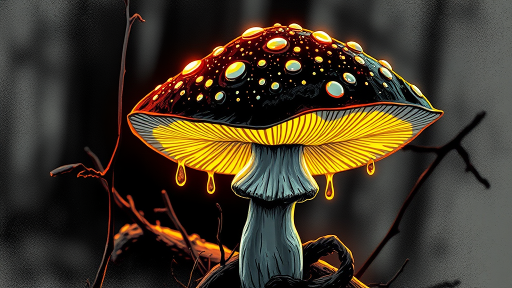 Effulgent glowing forest fungi, glistening droplets, neon hues encircling the mushroom, ethereal, highly detailed monochrome, awkwardly sketched, distorted form, incorrect anatomy, additional appendage, absent limb, disjointed limbs.