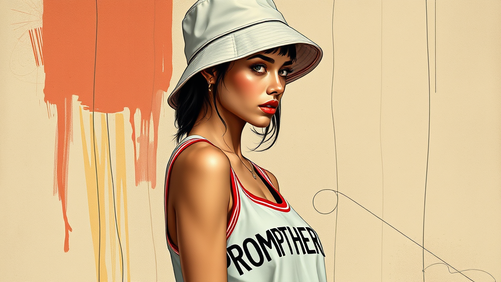 Egon Schiele-inspired artwork featuring a stylish Colombian supermodel in a side profile pose. She is wearing a chic tank top jersey emblazoned with the word "PROMPTHERO" across the front. Her look is accentuated by a playful pastel bucket hat. The image captures her youthful and vibrant essence, set against a modern art background, with distinct lines and expressive colors characteristic of Schiele's style. The model exudes a sense of confident elegance and contemporary fashion, encapsulating both grace and edginess. The composition is designed to emphasize her poise and charisma, maintaining the blend of art and high fashion aesthetics.