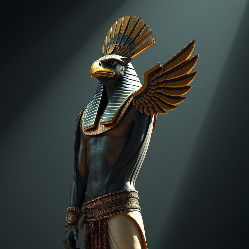 Egyptian deity Horus, embodying a falcon head atop a human body, standing in full length and height, exuding an air of elegance and wisdom. This dignified and mature figure is visually striking with a perfect blend of beauty and masculinity. Captured in a highly detailed and photorealistic style, the scene is enhanced by cinematic lighting that highlights the intricate details and textures, showcasing a godlike presence that commands both reverence and admiration.