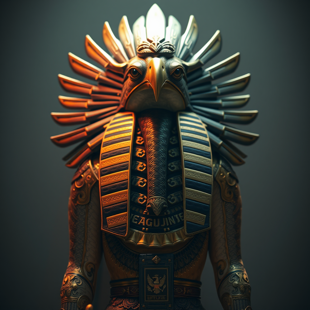 Egyptian deity Horus, falcon-headed, human form, depicted in full length and stature, exuding elegance, wisdom, and beauty, with a robust and mature presence, intricately detailed, capturing a photorealistic essence under cinematic lighting, with subtle creative elements enhancing the divine and regal aura.