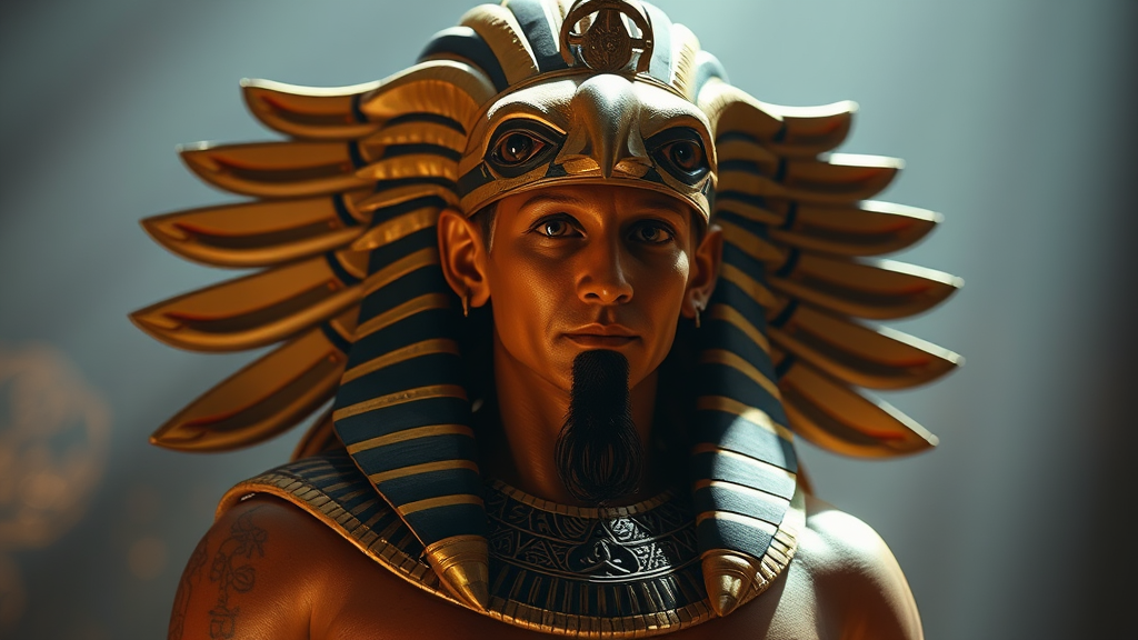 Egyptian deity Horus, featuring a majestic falcon head and a strong human body, depicted in full length and height, exuding elegance, wisdom, and beauty. His mature and manly presence is captured with highly detailed, photorealistic features under dramatic, cinematic lighting, enhancing the mythical aura with subtle creative nuances.
