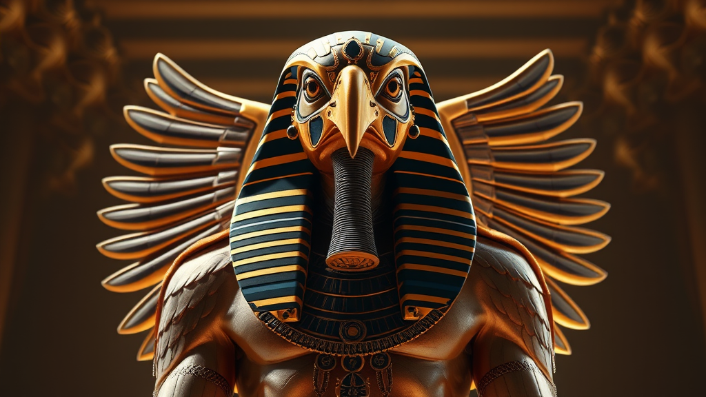 Egyptian god Horus, featuring a majestic falcon head atop a strong human body, standing full height in an elegant and graceful pose. Exuding wisdom and captivating beauty, his mature and manly presence is depicted in stunning photorealistic detail under cinematic lighting, with subtle creative enhancements emphasizing his divine nature and regal aura.