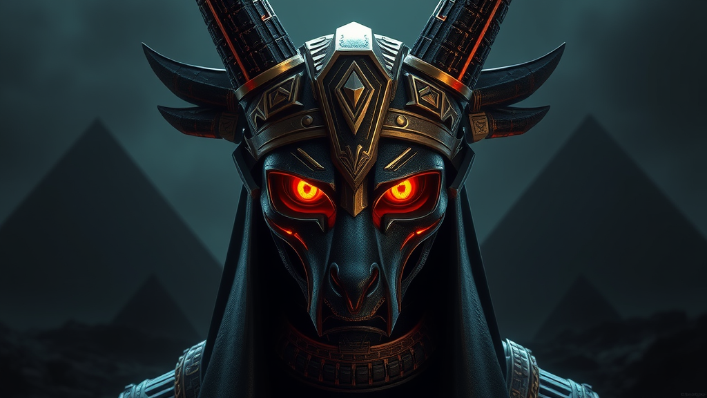 Egyptian male Anubis in a cyberpunk setting, dark and atmospheric with black pyramids in the background, featuring hyperdetailed and captivating eyes. A scene of hyperrealism, intricately detailed and epic, drawing on dark fantasy elements in a style reminiscent of a masterwork by Greg Rutkowski. The artwork boasts 8k resolution with dynamic lighting, showcasing eldritch and mysterious undertones. The composition is precise, avoiding poorly drawn elements or unrealistic anatomy, instead focusing on a fluid, clear representation that captures the essence of a sophisticated and surreal splash art piece trending on Artstation. This portrayal is centered, with no confusing elements, delivering a coherent and striking depiction, free from artifacts or unnecessary embellishments.