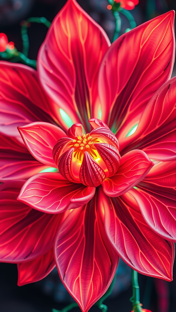 Elaborate blossom, vibrant neon circuitry, meticulously detailed, hyper-realistic, three-dimensional design.