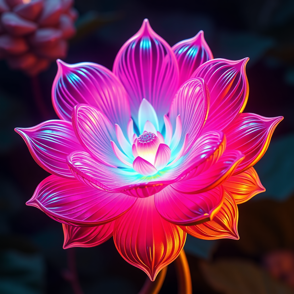 Elaborate blossom, vibrant neon glow, meticulously detailed, hyper-realistic, immersive 3D form.