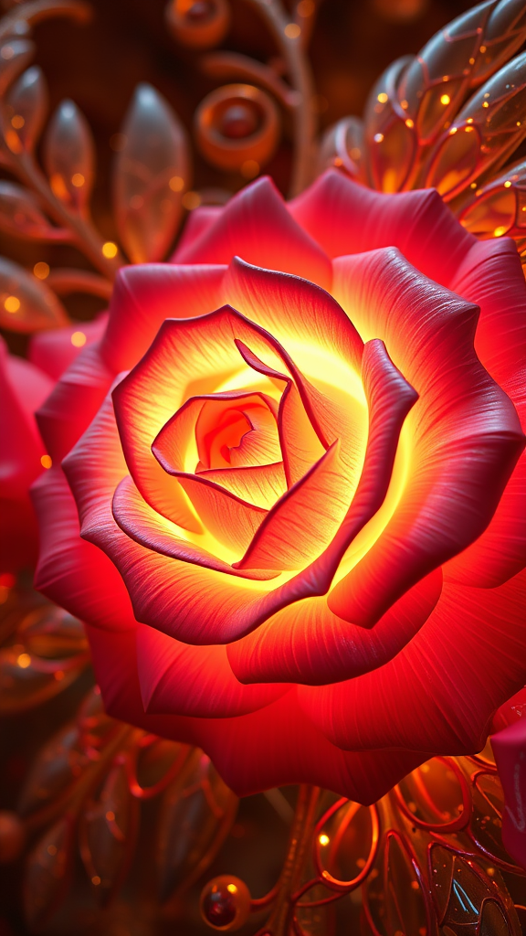 elaborate rose, electric glow, intricately detailed, hyper-realistic, immersive 3d design