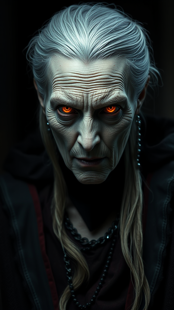 Elderly female ancient Strigoi vampire with an air of superiority, exuding horror, ultra-detailed features illuminated by dramatic lighting against a dark, foreboding background, with a focus on her piercing eyes and regal presence, capturing the essence of timeless power and eerie elegance, atmospheric and richly textured in tone and mood.