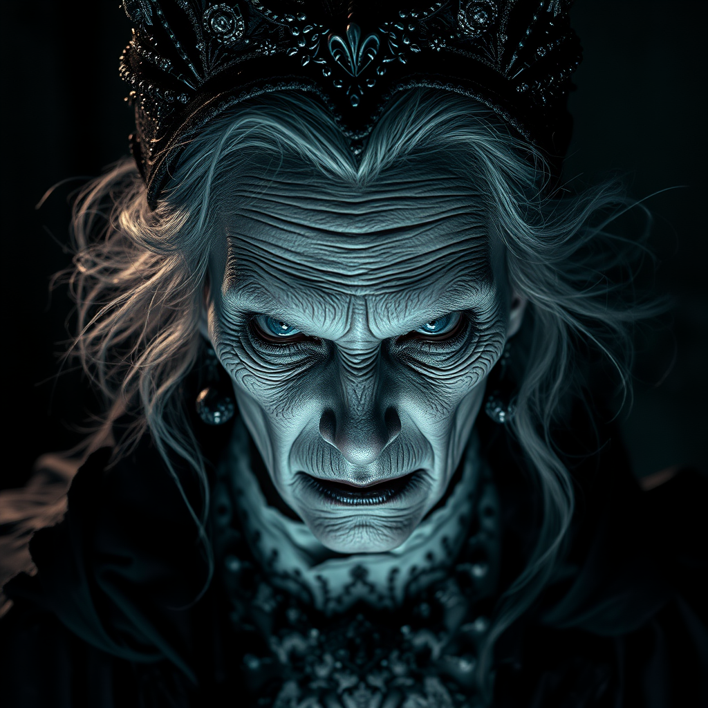 Elderly female dominant ancient Strigoi vampire, deep horror elements, intricately detailed features, vivid HDR, striking and moody lighting, shadowy background, foreboding aura, hints of regal attire and ancient lineage, sharp and mesmerizing eyes, ethereal presence, embodying dark elegance and timeless power.
