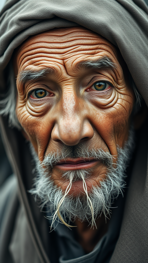 Elderly fisherman professional medium-shot portrait, around 50 years old, with a serene expression, captured with a Nikon Z9 at 100mm and an aperture of f/1.8. He has unusual, captivating robotic eyes that add an intriguing element to his weathered face. His form seems subtly exaggerated, with hints of additional limbs and fingers that seem out of place, adding a surreal, imaginative twist. The overall image has a slight blur, lending a dreamy, ethereal quality, while maintaining an air of mystery with muted, desaturated tones. The portrait, though abstract and creatively distorted, captures the essence of a seasoned fisherman in a unique and thought-provoking way.