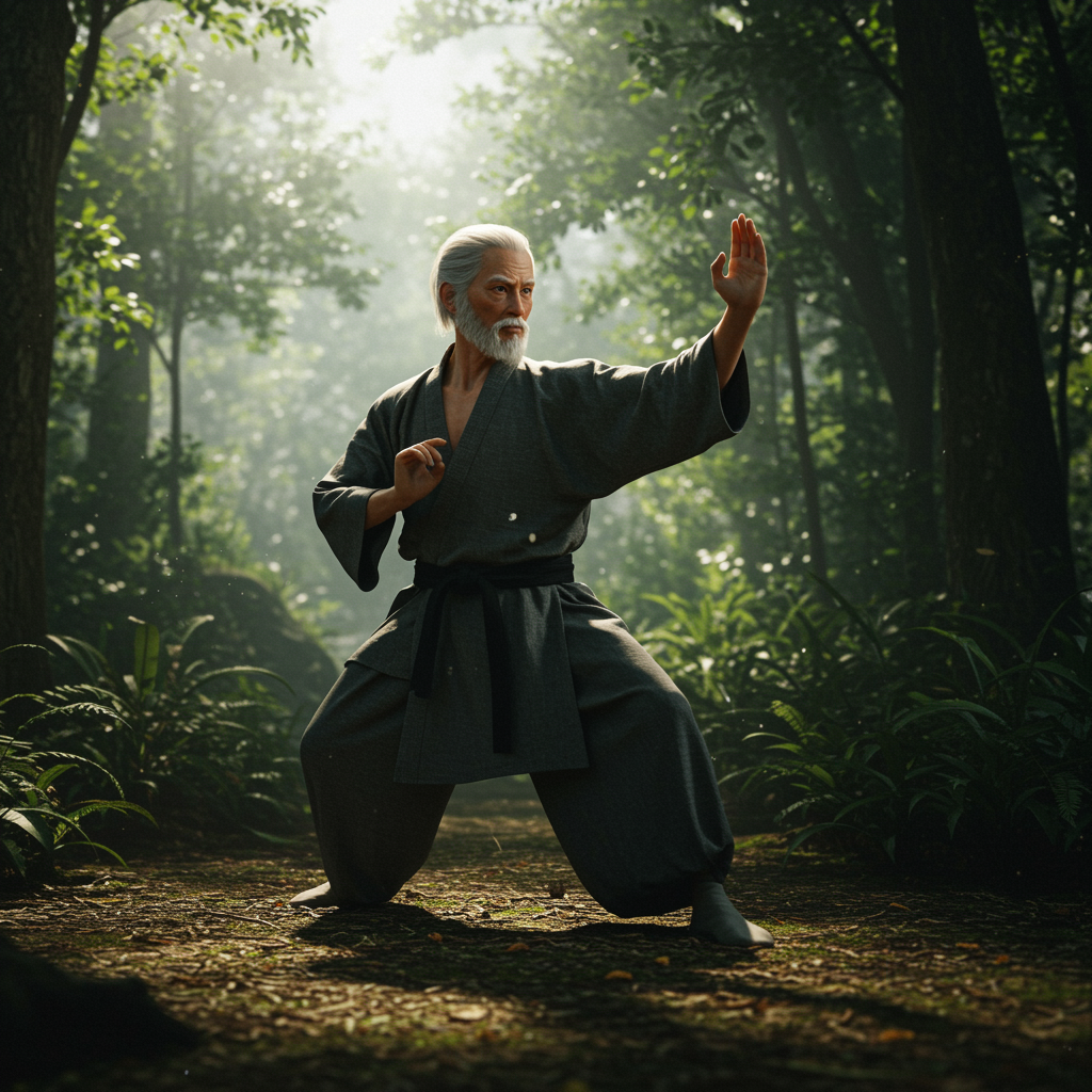 A lifelike elderly Japanese man practicing martial arts in a breathtaking outdoor forest scene, surrounded by lush greenery and dappled sunlight filtering through the trees. The intricate details capture the grace and precision of his movements, while the composition adheres to the rule of thirds and the golden ratio, reminiscent of a cinematic masterpiece. The style reflects a classical oil painting, blending the genius of Da Vinci with the modern flair of Greg Rutowski. Dramatic lighting enhances the mood, casting dynamic shadows and highlights across the scene, evoking a sense of timelessness and mastery.